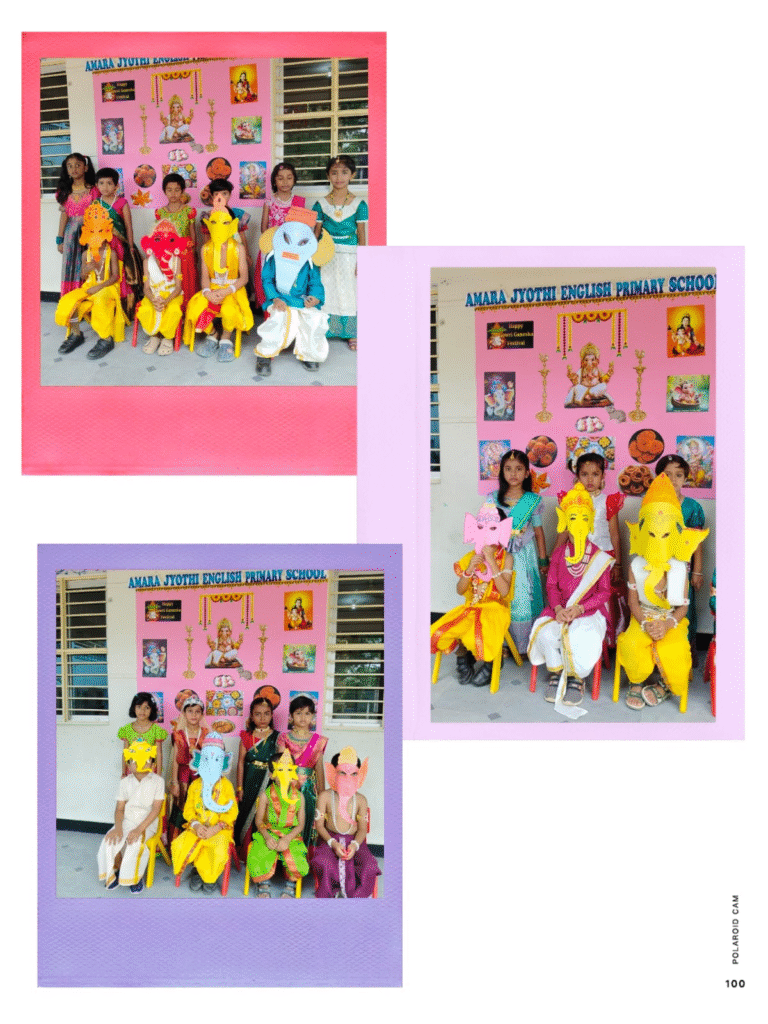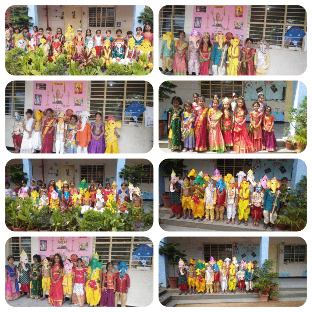 Ganesh Chaturthi for the tiny tots at Amara Jyothi English Primary School is a delightful spectacle. They create paper plate masks and clay idols, sing simple “Ganpati Bappa Morya” songs, and listen wide-eyed to stories of the beloved elephant god. The celebration ends with a joyful distribution of modak sweets.